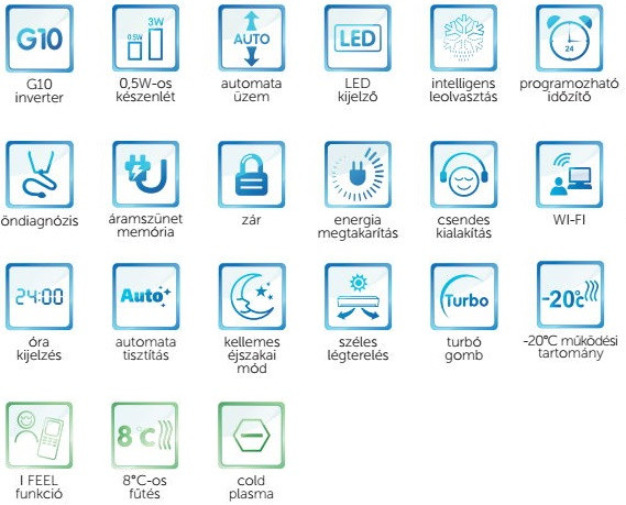 Felszerelés és beüzemelés díja bruttó 55.000 Ft, mely tartalmazza a kiszállást, a készülék helyszínre szállítását, a kültéri és beltéri egység felszerelését, elektromos betáp kiépítését aljzatba max. 5 méterig*, a kültéri tartókonzolt, rögzítő elemeket, a vákuumozást, a berendezés beüzemelését és azzal kapcsolatos dokumentumok kitöltését (pl.: beüzemelési jegyzőkönyv, garanciajegy...), valamint a takarítást.